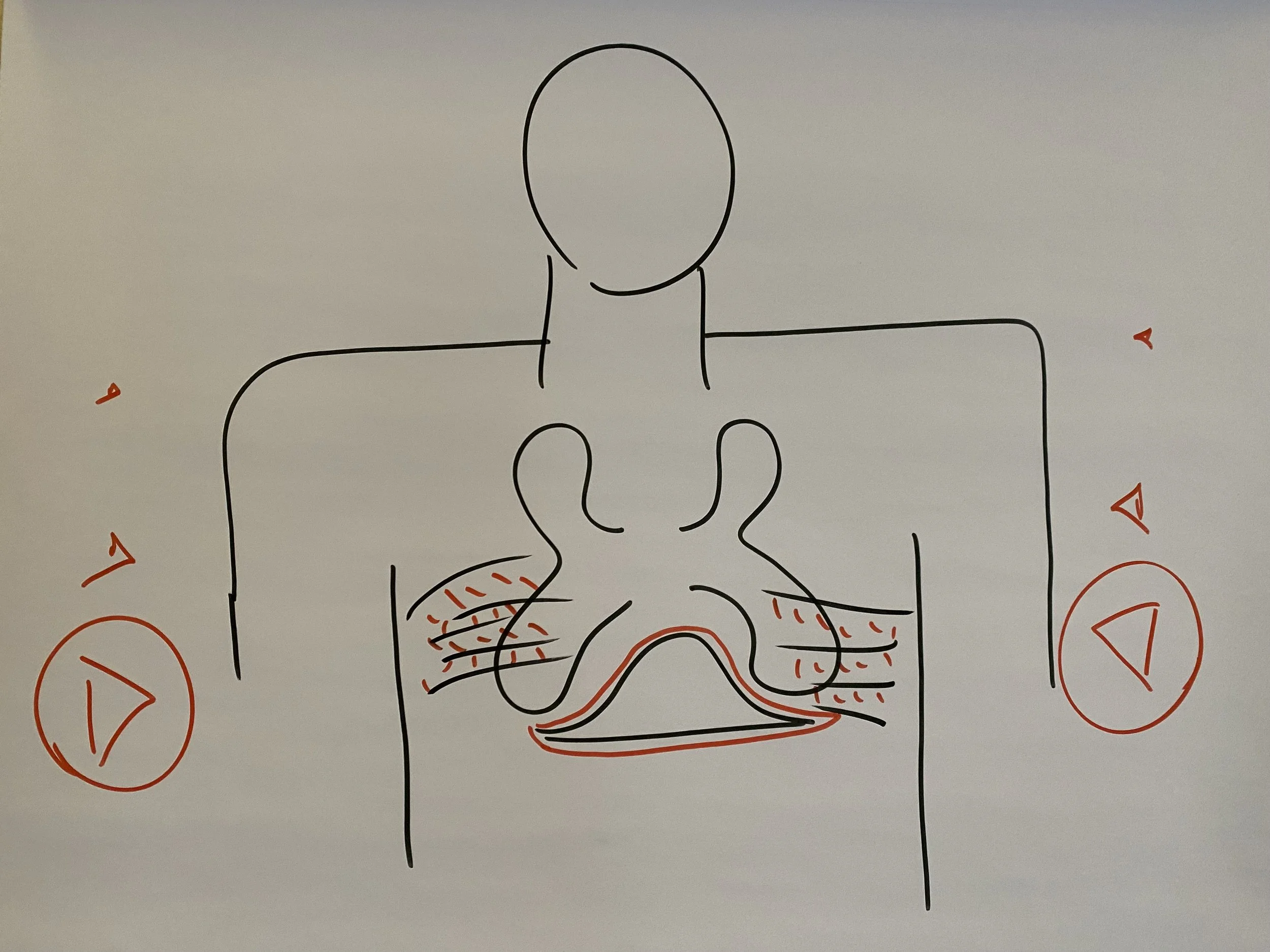 Die Zwischenrippenmuskeln (Interkostalmuskulatur), die sich zwischen den Rippen befinden, unterstützen das Zwerchfell, indem sie den Brustkorb erweitern und stabilisieren. Sie helfen, das Lungenvolumen beim Einatmen zu vergrößern, und kontrollieren auch das Ausatmen. Atemhilfsmuskeln wie der Kopfwender (Musculus sternocleidomastoideus), die Treppenmuskeln (Skalenusmuskeln) und andere Muskeln des oberen Brustkorbs und der Schultern kommen normalerweise nur bei angestrengter Atmung, starker körperlicher Belastung oder Atemnot zum Einsatz. Bei gesunder, entspannter Atmung bleiben sie weitgehend inaktiv und dienen eher als Reserve denn als Hauptakteure.
